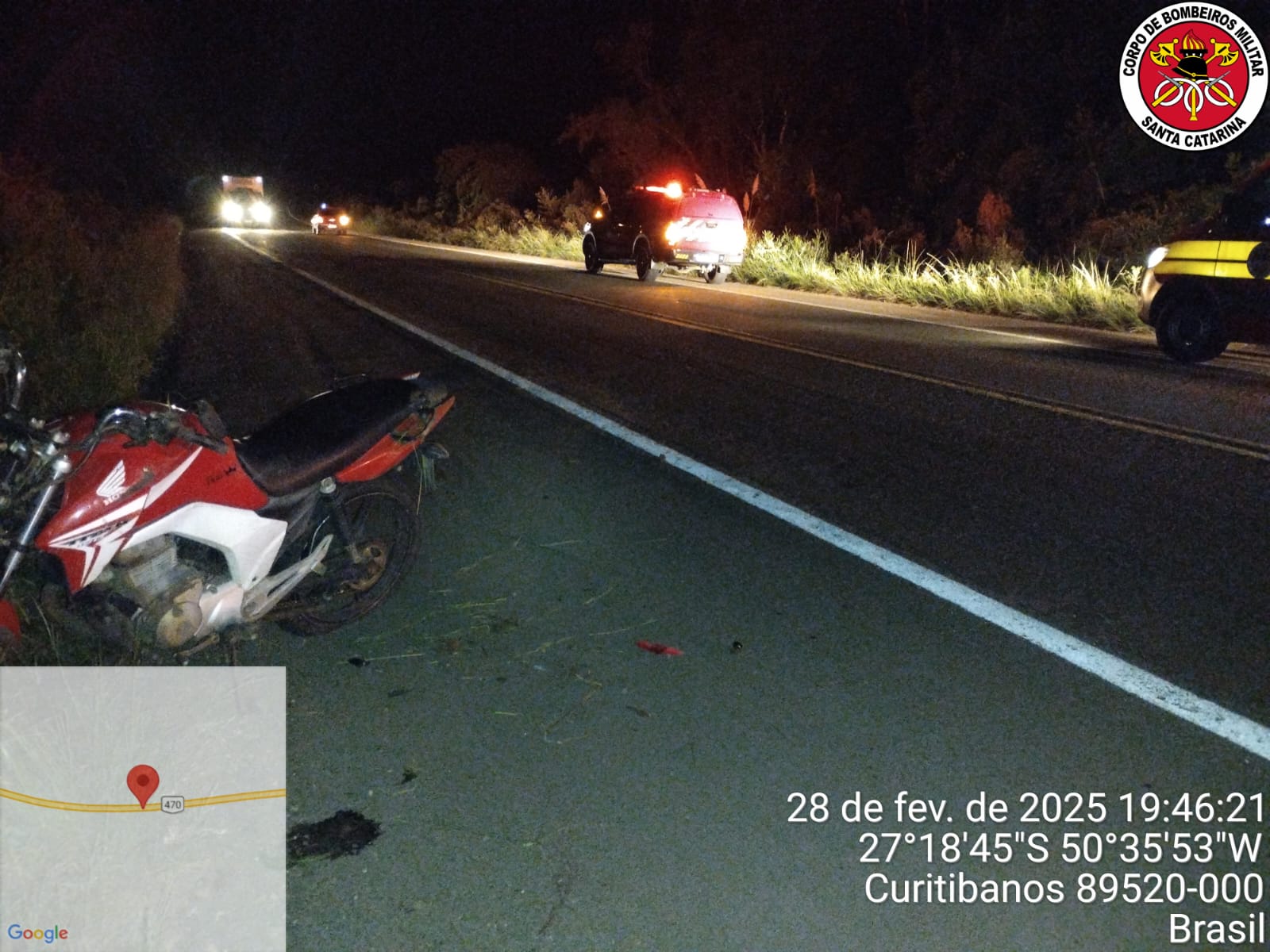 Uma mulher de 24 anos morreu no início da noite desta sexta-feira (28) após uma queda de motocicleta na BR-470, em Curitibanos. O acidente ocorreu por volta das 19h35min, a cerca de 2 km do trevo de acesso ao município. O condutor da moto, um homem de 32 anos, sofreu lesão no ombro esquerdo e escoriações generalizadas. Ele foi encaminhado ao Hospital Hélio Anjos Ortiz.