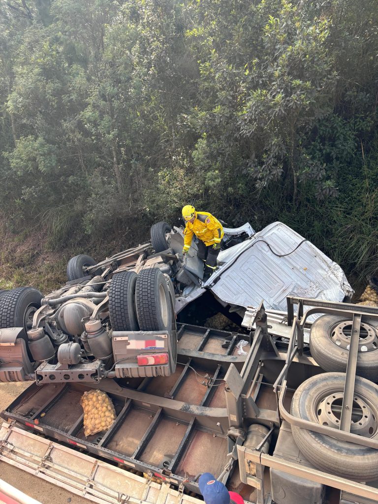 O Corpo de Bombeiros de Bom Retiro foi acionado para um acidente de trânsito na BR–282, km 115, em Bom Retiro. No local confirmou-se a ocorrência, sendo um tombamento de um caminhão Mercedes-Benz Axor com o condutor preso às ferragens.