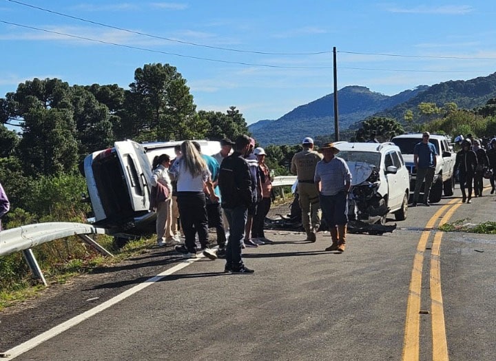 Uma colisão envolvendo quatro carros deixou varías pessoas feridas e interditou totalmente a SC-110 no município de Urubici em SC, na tarde deste domingo (20), informou a Polícia Militar Rodoviária (PMRv). Pelo menos seis pessoas foram levadas ao hospital, de acordo com o Corpo de Bombeiros Militar. Até 16h15, a rodovia permanecia interditada, segundo a PMRv.