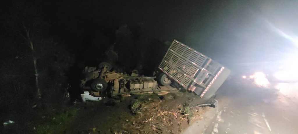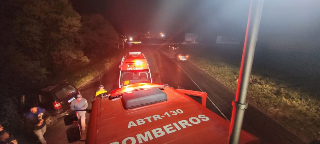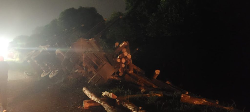 O caminhão VW 23360 placas Mercosul que transportava toras de pinus, tendo como condutor um masculino e 36 anos e o caroneiro seu filho um menor de 14 anos, tombou no acostamento após colidir com o veículo Chevrolet Zafira placas Mercosul, tendo este dois ocupantes em seu interior, sendo o condutor um masculino de 53 anos, e uma feminina de 50 anos. Os ocupantes do caminhão sofreram ferimentos leves sendo conduzidos para o Hospital Infantil e Hospital Nossa Senhora dos Prazeres pelas equipes do ASU 481 e do SAMU. O condutor do veículo Zafira sofreu uma fratura exposta em membro superior, tendo rebaixamento de consciência, sendo atendido pela USA 01 do SAMU e posteriormente conduzido ao Hospital Nossa Senhora dos Prazeres juntamente com sua esposa a segunda ocupante do veículo, a qual sofreu ferimentos leves e escoriações. No local permaneceu a Polícia Rodoviária Federal.