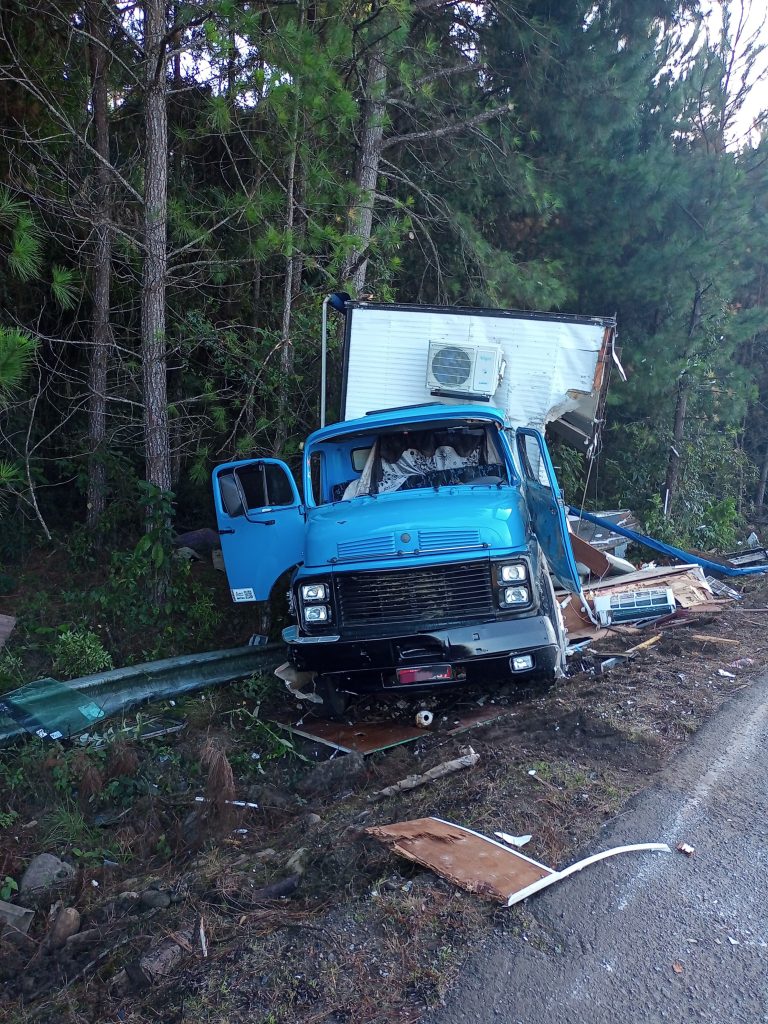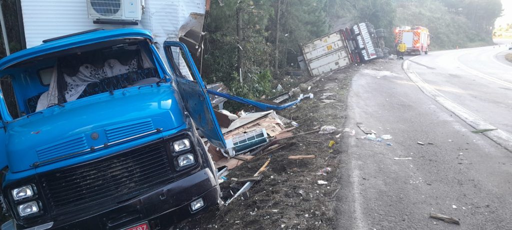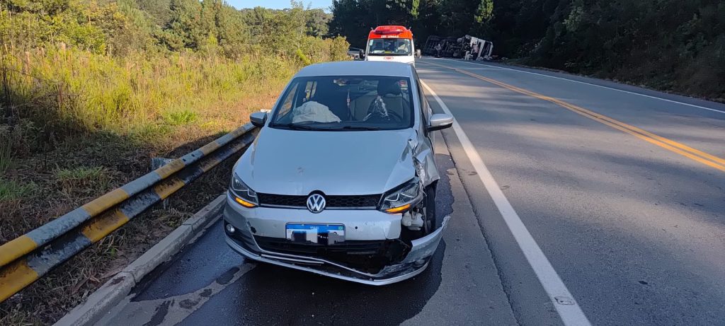 Na manhã desta sexta-feira (25), um caminhão tombou e atingiu uma outra carreta e um carro na BR-282, na região de Lomba Alta, no município de Alfredo Wagner. Segundo o relato do Corpo de Bombeiros Militar de Santa Catarina, o primeiro veículo atingido foi o caminhão, que passava ao lado no momento do tombamento.