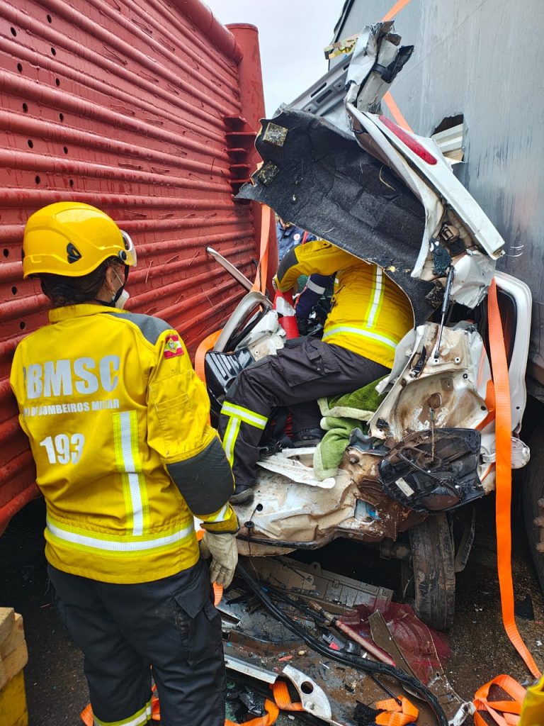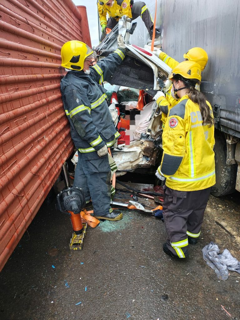 Foi necessário o corte completo do teto do veículo para ter acesso à vítima. Em seguida, com o uso de um expansor hidráulico, parte de um dos caminhões teve que ser parcialmente erguida para permitir o acesso seguro as pernas da pessoa ferida.