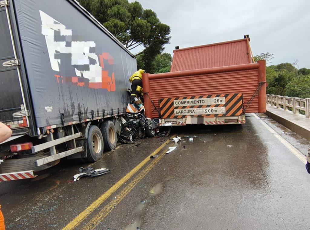 O Corpo de Bombeiros Militar de Campos Novos foi acionado às 14h42 para atender à ocorrência. No local, a equipe de socorro, constatou que um caminhão Volvo de cor branca e um Mercedes-Benz de cor verde haviam colidido, prensando um terceiro veículo entre eles. Os danos no carro de passeio eram tão severos que não foi possível identificar o modelo.
