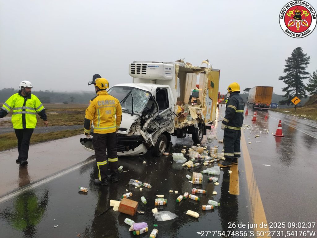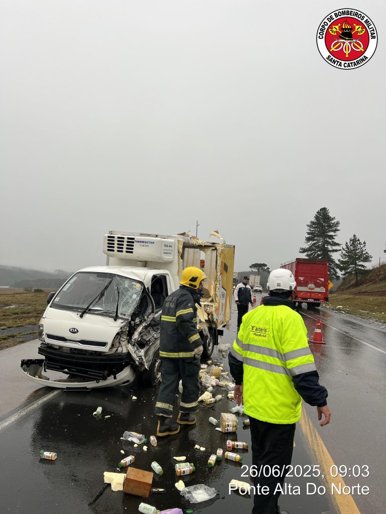 Por volta das 8h46min da na manhã desta quinta-feira (26), o Corpo de Bombeiros foi acionado para atender o acidente na BR-116, km 163, em Santa Cecília, envolvendo um caminhão Volkswagen e um caminhão Kia UK2500. Os veículos colidiram lateralmente.