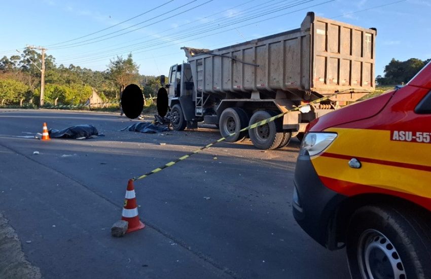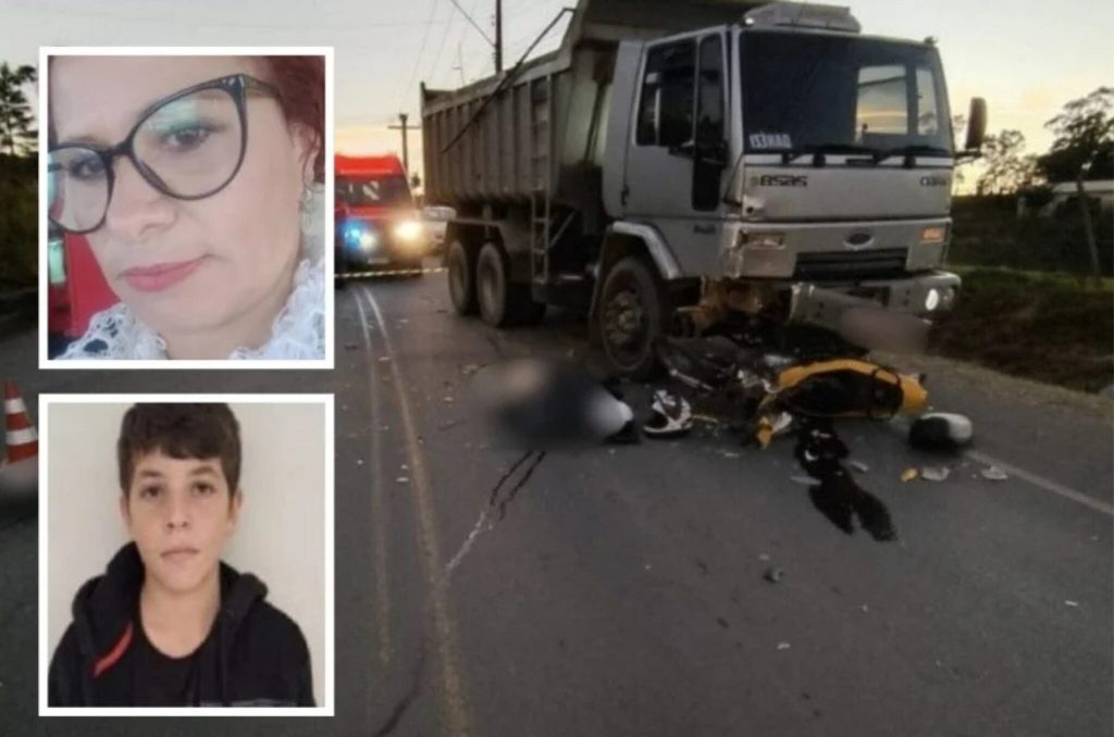 Uma colisão entre um caminhão e uma motocicleta resultou na morte de Terezinha Piva, 48 anos e de Lorenzo Piva Nogueira, 12 anos