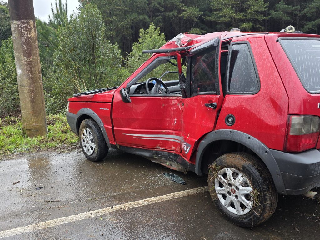 Neste momento, nossa equipe de reportagem está na Avenida Santa Catarina, entre o portal de entrada da cidade e o trevo da Lactoplasa, onde ocorreu um acidente envolvendo um Fiat Uno vermelho. O veículo, que seguia da BR-116 sentido Lages, perdeu o controle e colidiu violentamente contra um poste.