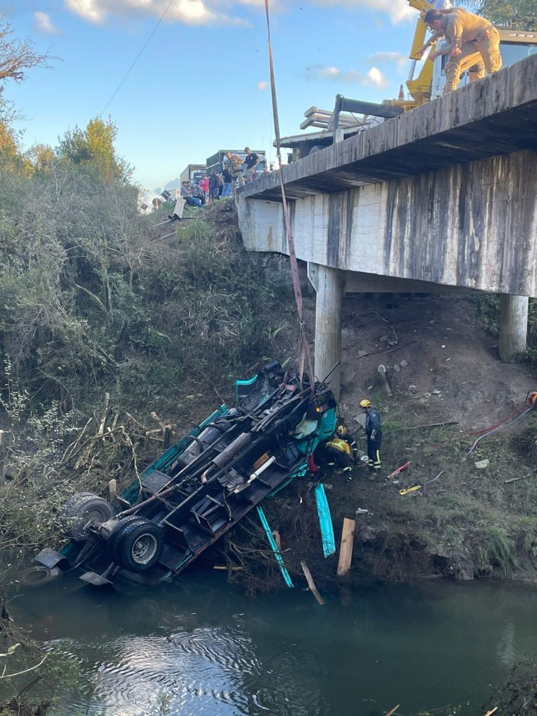 Um caminhão Mercedes-Benz 1214, de cor verde, caiu de uma ponte na SC-114, em Otacílio Costa, na tarde desta terça-feira (16), por volta das 14h12, no km 175 da rodovia. O veículo ficou com a cabine submersa no rio.