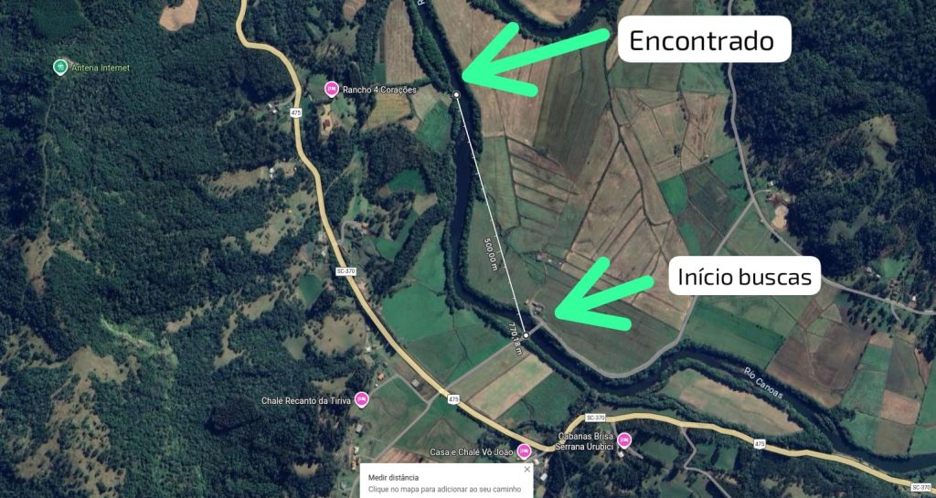Por volta das 10h, a vítima foi encontrada a cerca de 700 metros rio abaixo, na margem esquerda do rio, em decúbito ventral (com o rosto voltado para baixo). O corpo foi retirado com uso de equipamentos e apoio de populares que auxiliaram com um trator.