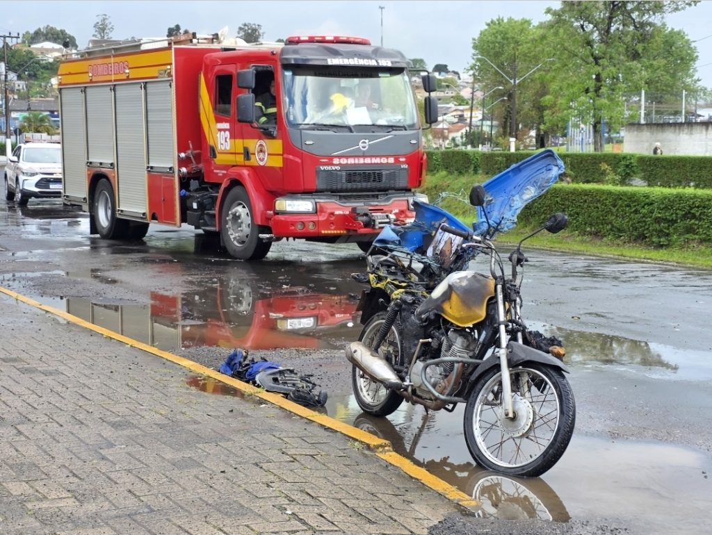 Com o impacto da colisão, a moto acabou pegando fogo. O Corpo de Bombeiros foi acionado e rapidamente controlou as chamas. Apesar do susto, ninguém ficou ferido.
