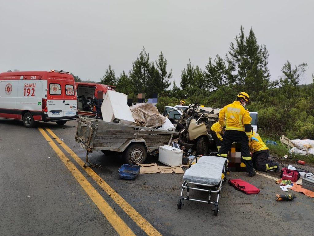 A colisão frontal envolveu dois veículos: um VW Golf, placas Mercosul, e um Fiat Uno Mille com carretinha, também de placas Mercosul.