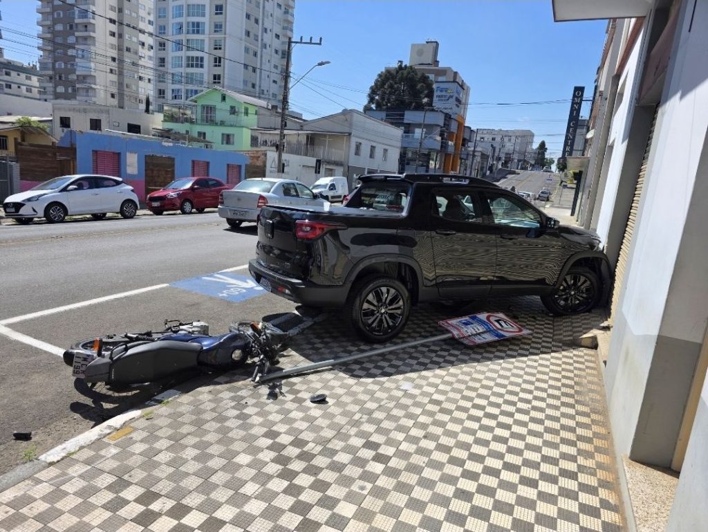 O motorista de uma Fiat Toro perdeu o controle da direção, bateu e passou por cima de uma moto que estava estacionada na Rua Rui Barbosa, no centro de Lages. O acidente ocorreu na manhã deste sábado, dia 22, após o condutor sofrer um mal súbito. Além da moto, o veículo também colidiu contra uma placa de sinalização e só parou após atingir a parede de um estabelecimento comercial.