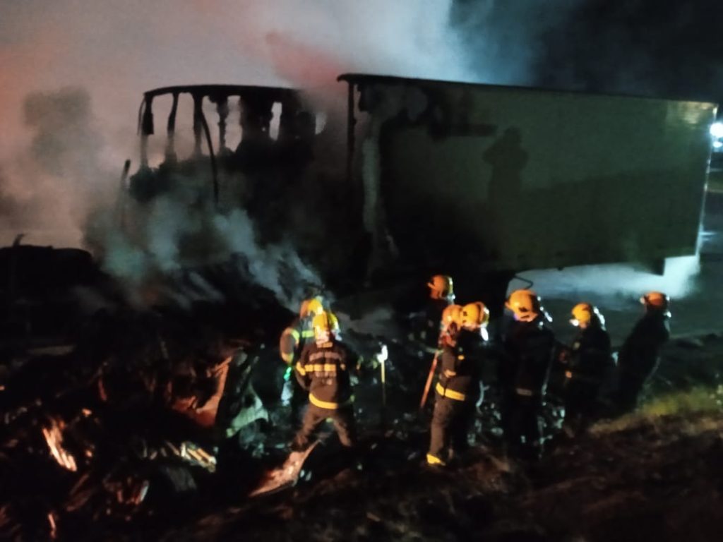 De acordo com o Corpo de Bombeiros, as vítimas estavam no automóvel, que acabou atingindo a lateral de uma carreta que transportava linguiça calabresa. Com o impacto, ambos os veículos pegaram fogo.