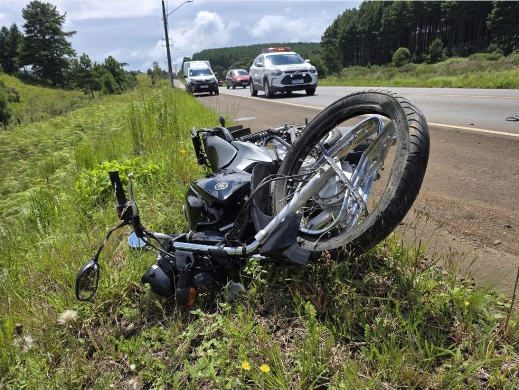 Ao perceber a situação, o motorista do caminhão desviou para o acostamento, mas o motociclista acabou atingindo os pneus do veículo. Com o impacto, ele ficou ferido e precisou ser imobilizado.
