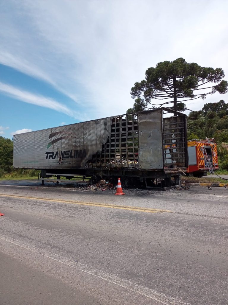 Um incêndio atingiu a carga de uma carreta na manhã desta terça-feira (4), por volta das 7h52, no km 176 da BR-282, em Bom Retiro. A ocorrência foi atendida pela guarnição do ABTR-189, do Corpo de Bombeiros Militar da OBM de Bom Retiro.