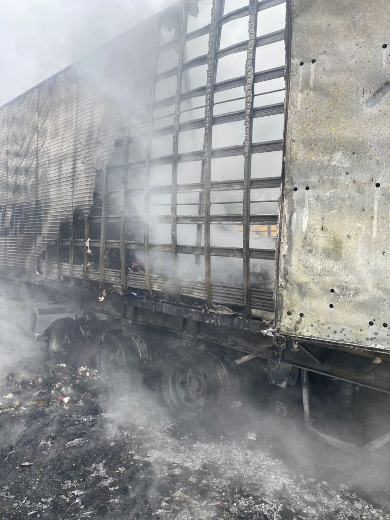 Ao chegar ao local, os bombeiros confirmaram que as chamas estavam restritas à carga do semirreboque, que se encontrava no acostamento da rodovia. O cavalo mecânico já havia sido desacoplado e não foi atingido pelo fogo. Havia grande quantidade de fumaça e de material transportado no local.