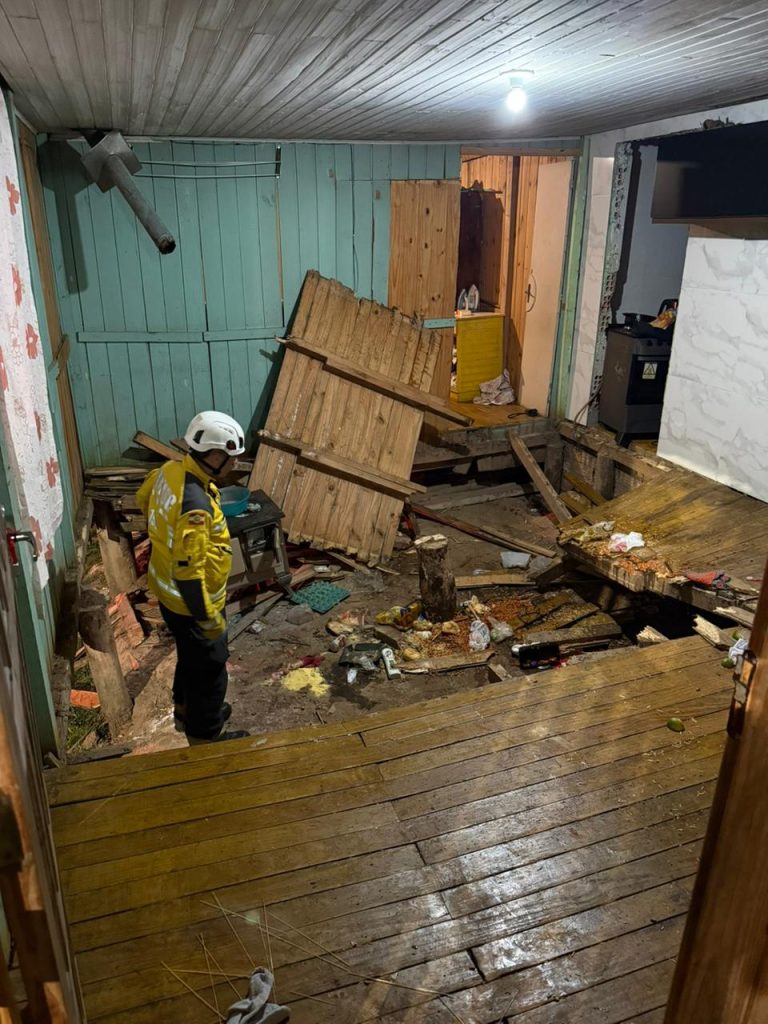 Um desabamento de assoalho de madeira em uma residência mobilizou equipes do Corpo de Bombeiros na noite de sábado (21), por volta das 22h43, na Rua Dejaime Joaquim Alves, nº 27, no bairro Passo Fundo.