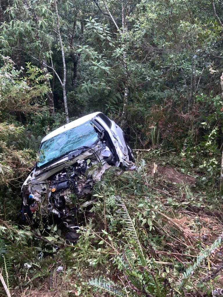 As vítimas do carro precisaram ser retiradas com técnicas de resgate veicular, após estabilização do veículo na ribanceira.