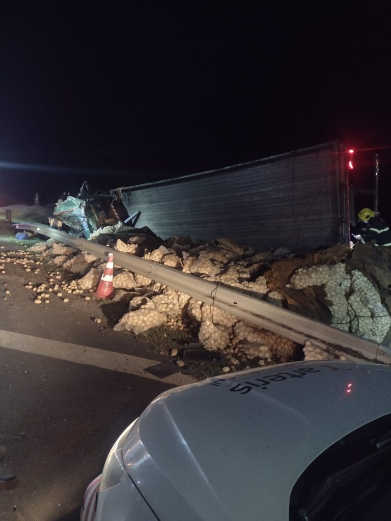 Um caminhão carregado com batatas tombou na noite desta quarta-feira (8) na altura do km 193 da BR-116, mobilizando equipes de resgate em Santa Catarina.
