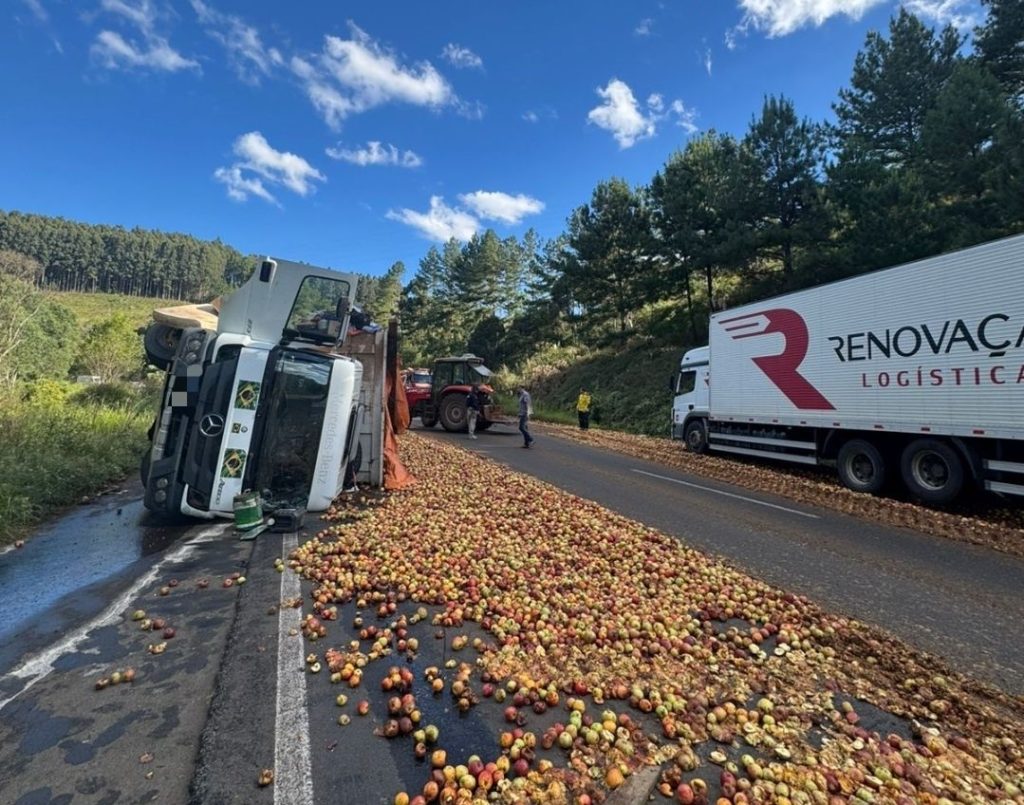 Parte da carga de maçã ficou espalhada sobre a pista, exigindo a atuação conjunta das equipes para a liberação da via. Com o apoio da Polícia Rodoviária Federal e auxílio de populares, foi realizada a retirada parcial dos produtos.
