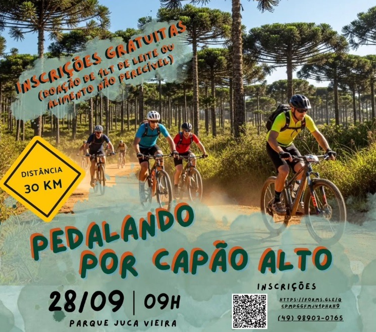 No dia 28 de setembro (domingo), às 9h, Capão Alto realiza o evento Pedalando por Capão Alto, com concentração no Parque Juca Vieira. A iniciativa faz parte das comemorações do aniversário do município e é destinada a quem gosta de esporte, natureza e diversão em duas rodas.