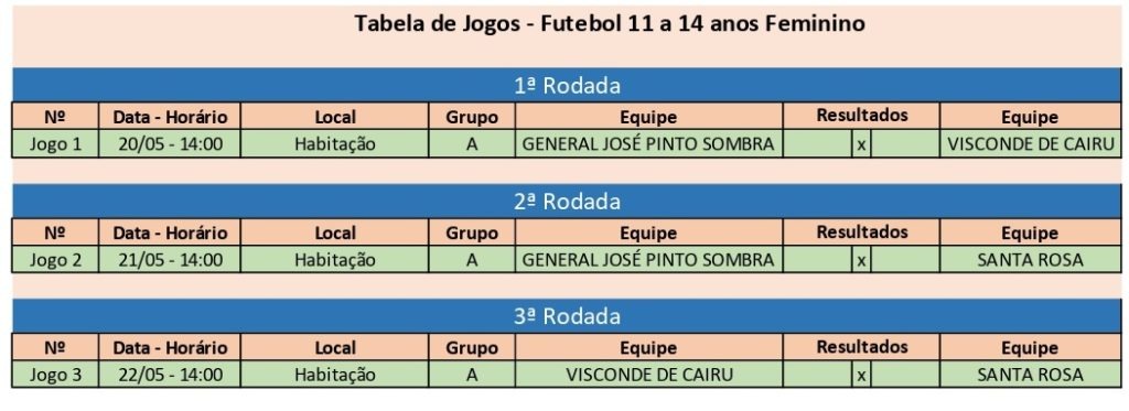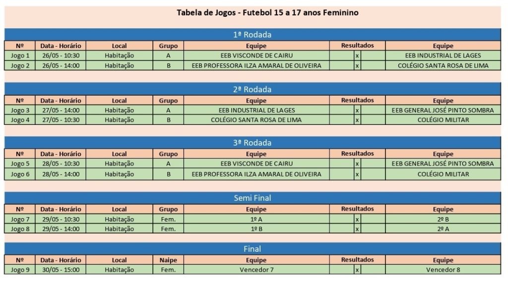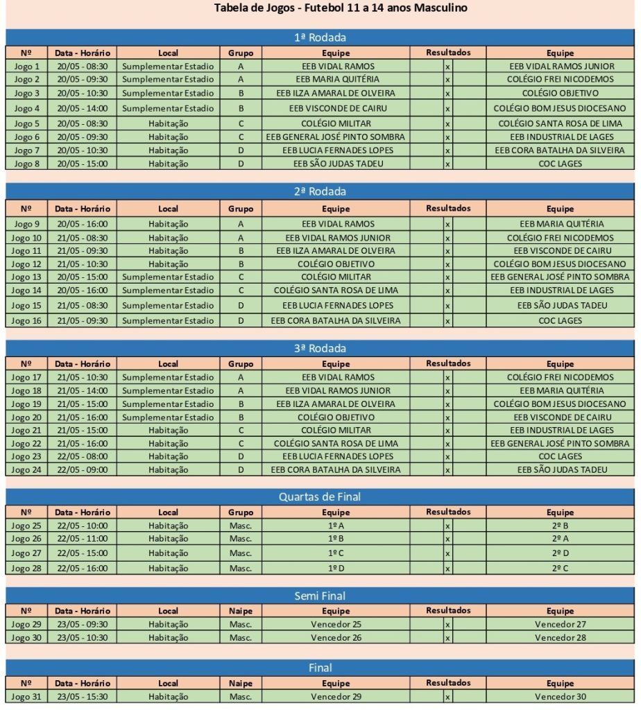 A disputa será dividida em duas categorias etárias (11 a 14 anos e 15 a 17 anos), com jogos nos naipes masculino e feminino. As partidas acontecerão entre os dias 20 e 30 de maio, nos campos do bairro Habitação e no campo suplementar do Estádio Municipal Vidal Ramos Júnior. Os campeões municipais de cada categoria e gênero garantirão vaga na fase microrregional, a ser realizada nas cidades de Anita Garibaldi (11 a 14 anos) e São José do Cerrito (15 a 17 anos).