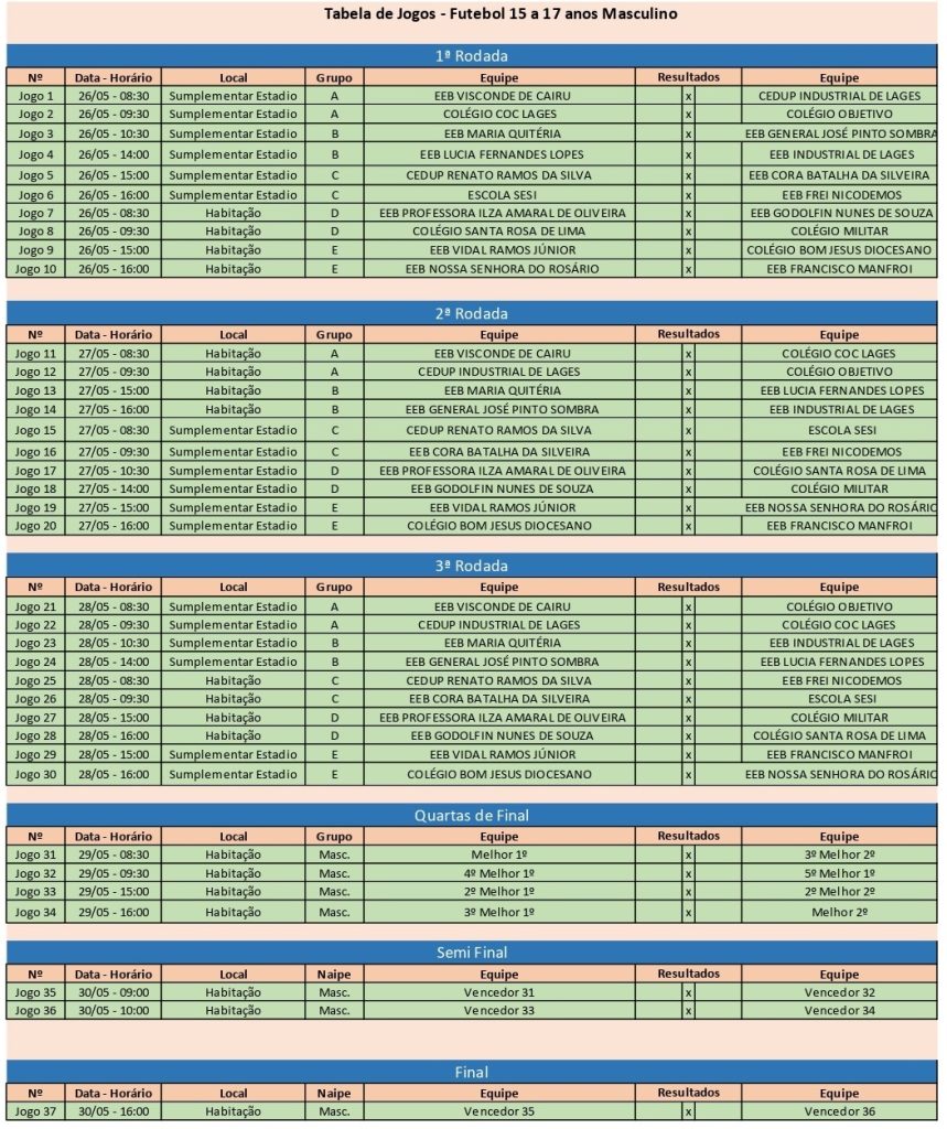 - Grupo A: E.E.B. Visconde de Cairú, Centro de Educação Profissional (Cedup) Industrial de Lages, Colégio COC Lages e Colégio Objetivo