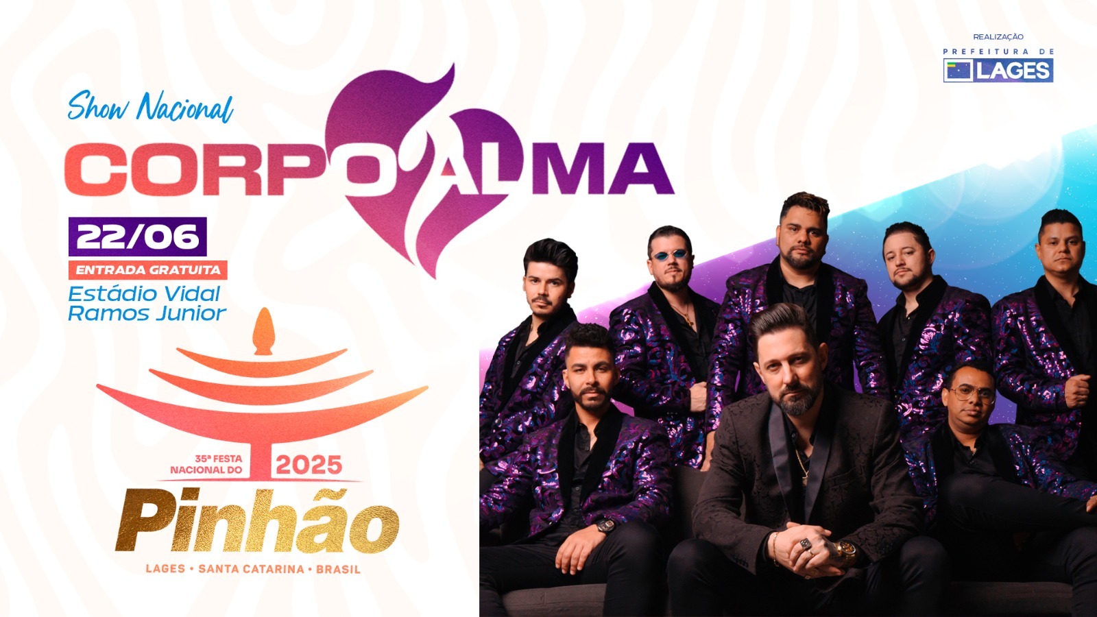 Para relembrar os antigos bailes embalados pelas tradicionais e carinhosamente chamadas “bandinhas”, o grupo Corpo e Alma, uma das precursoras deste estilo no sul do Brasil, mais uma vez subirá ao palco da Festa Nacional do Pinhão, na estrutura a ser montada nas dependências do Estádio Municipal Vidal Ramos Júnior. O show acontece no dia 22 de junho, domingo e marcará com grande estilo o encerramento do evento.