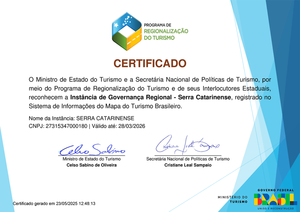 A certificação foi concedida pelo Ministério do Turismo, por intermédio do Programa de Regionalização do Turismo (PRT) e dos Interlocutores Estaduais do PRT, com assinatura do ministro de Estado do Turismo, Celso Sabino de Oliveira, e da secretária Nacional de Políticas de Turismo, Cristiane Leal Sampaio.