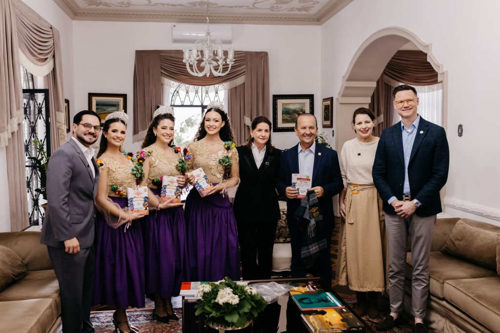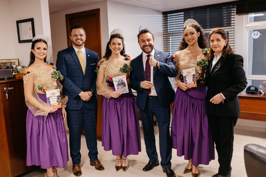 Além da prefeita e da corte, a comitiva também foi composta pela secretária de Turismo de Lages, Ana Vieira; pelo executivo de Comunicação da Prefeitura, Diogo Schimitz; e pelo cantor lageano Paulinho Guazzelli, representante da cena musical local.
