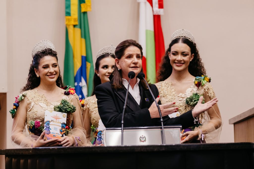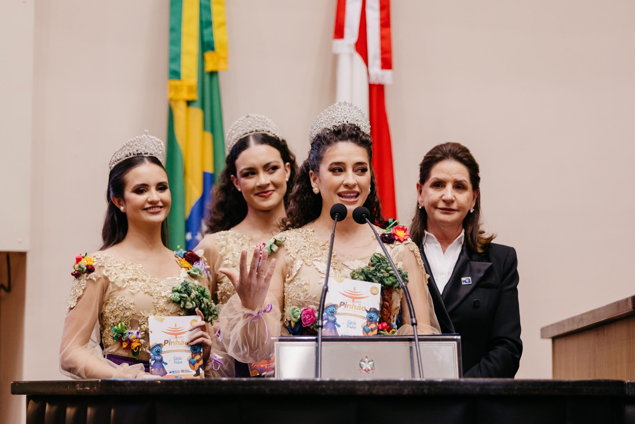 Na sequência, a rainha da 35ª edição, Amanda Bianchini, acompanhada das princesas Lariane Rodrigues e Alice Cunha Ramos, realizou o convite oficial aos deputados e deputadas. Ao final da fala, a realeza apresentou o jingle oficial da festa, encantando o plenário com a melodia que exalta o sabor do pinhão e o orgulho da cultura serrana.