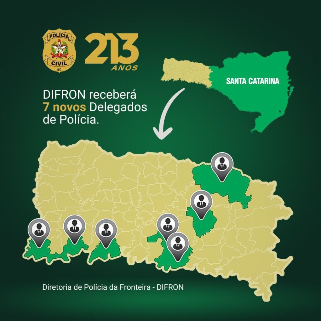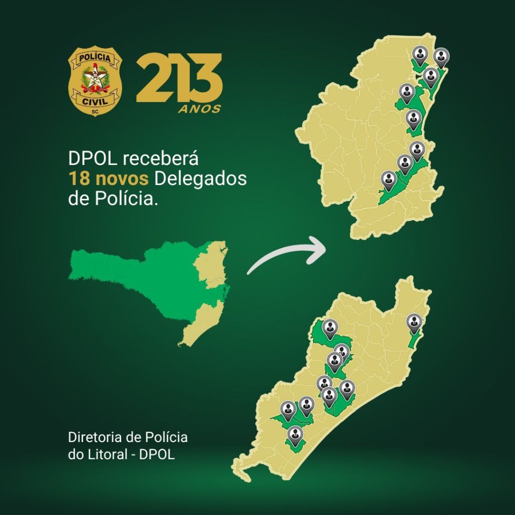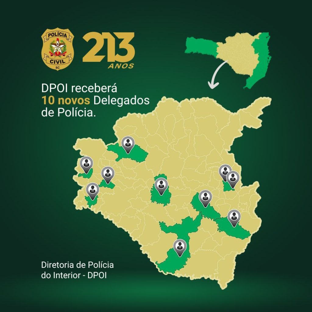 A Delegacia-Geral da Polícia Civil de Santa Catarina anunciou a designação de dez novos delegados para unidades do interior do estado. As nomeações contemplam dez delegacias vinculadas à Diretoria de Polícia do Interior (DPOI), abrangendo as regiões do Alto Vale, Serra Catarinense e Meio-Oeste.