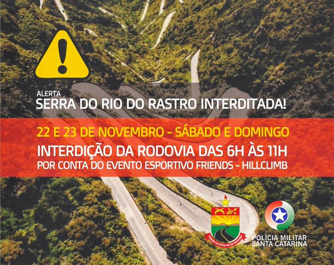 A Polícia Militar Rodoviária (PMRv) informou que a SC-390, no trecho da Serra do Rio do Rastro, será totalmente interditada nos dias 22 e 23 de novembro (sábado e domingo) para a realização do evento esportivo Friens – Hillclimb.