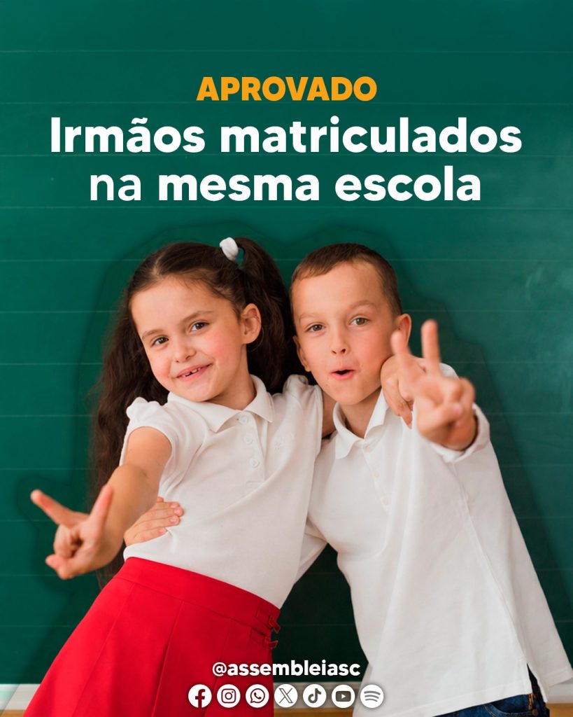 A Assembleia Legislativa de Santa Catarina aprovou um projeto de lei que garante prioridade para que irmãos sejam matriculados na mesma escola da rede estadual, desde que haja solicitação da família.