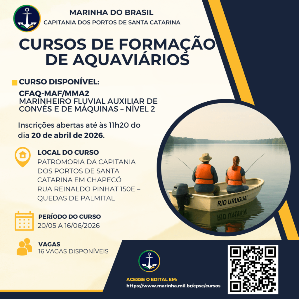A Marinha do Brasil, por meio da Capitania dos Portos de Santa Catarina, está com inscrições abertas para o Curso de Formação de Aquaviários – Marinheiro Fluvial Auxiliar de Convés e de Máquinas – Nível 2 (CFAQ-MAF/MMA2), que será realizado em Chapecó, no Oeste catarinense.