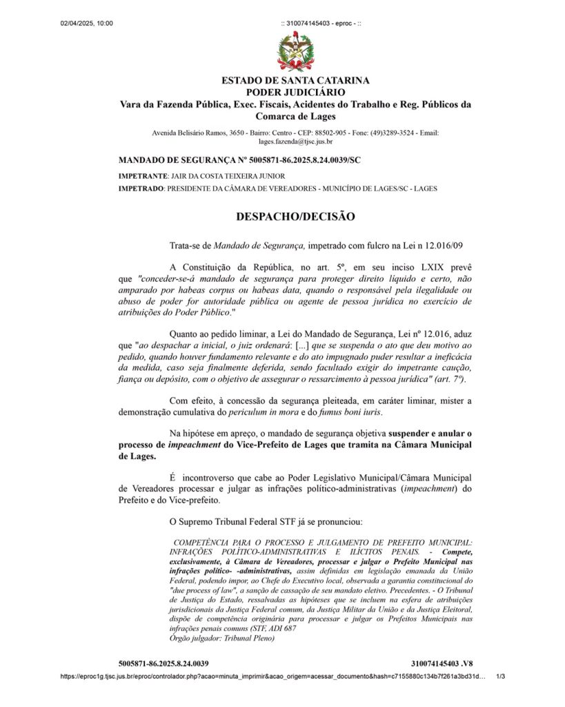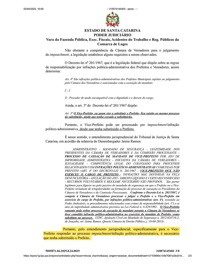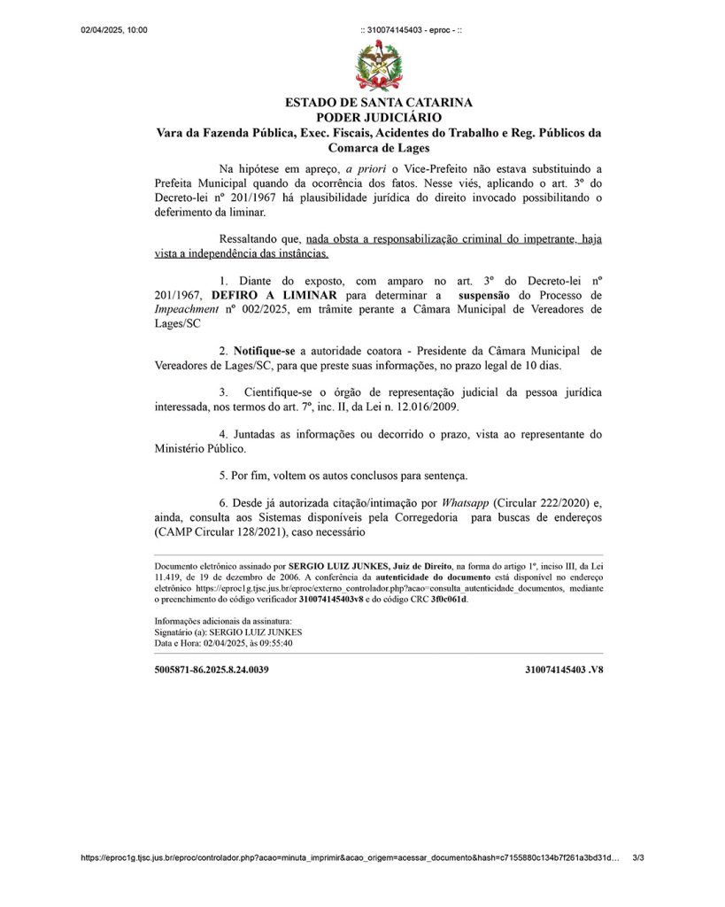 No dia 02 de abril, o juiz da Vara da Fazenda Pública da Comarca de Lages, em decisão liminar proferida em Mandado de Segurança impetrado pelo vice-prefeito, determinou a suspensão do processo de impeachment por entender que o procedimento não é cabível em face de vice-prefeito que não tenha substituído o prefeito.