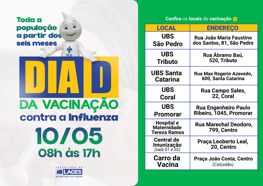 Prefeitura de Lages, através da Secretaria da Saúde, convida toda a população para participar do DIA D de Vacinação contra a Influenza (gripe), que acontece neste sábado, 10 de maio, das 8h às 17h, sem fechar ao meio-dia.