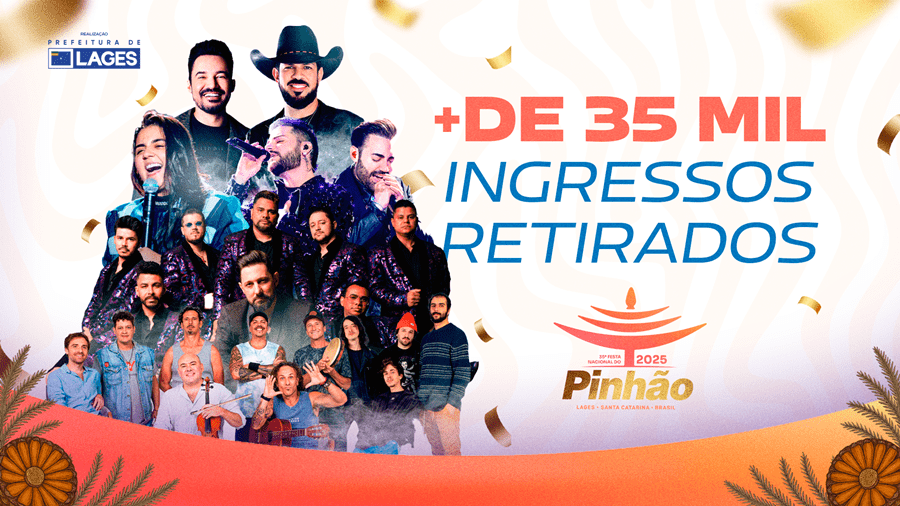 A duas semanas do início da 35ª Festa Nacional do Pinhão, Lages já contabiliza mais de 35 mil ingressos retirados antecipadamente. Moradores de 222 cidades, de 13 estados diferentes, já garantiram sua entrada para o evento, que ocorre de 6 a 22 de junho, com os shows sendo realizados no Estádio Municipal Vidal Ramos Júnior.