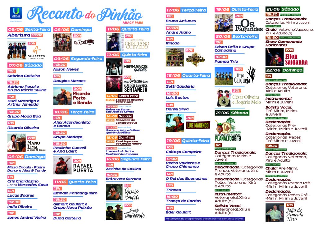 O Recanto do Pinhão abre espaço para artistas tradicionalistas locais, da Serra Catarinense e do Rio Grande do Sul. O show de abertura será com o grupo lageano Quarteto Coração de Potro, no dia 6 de junho, às 20h