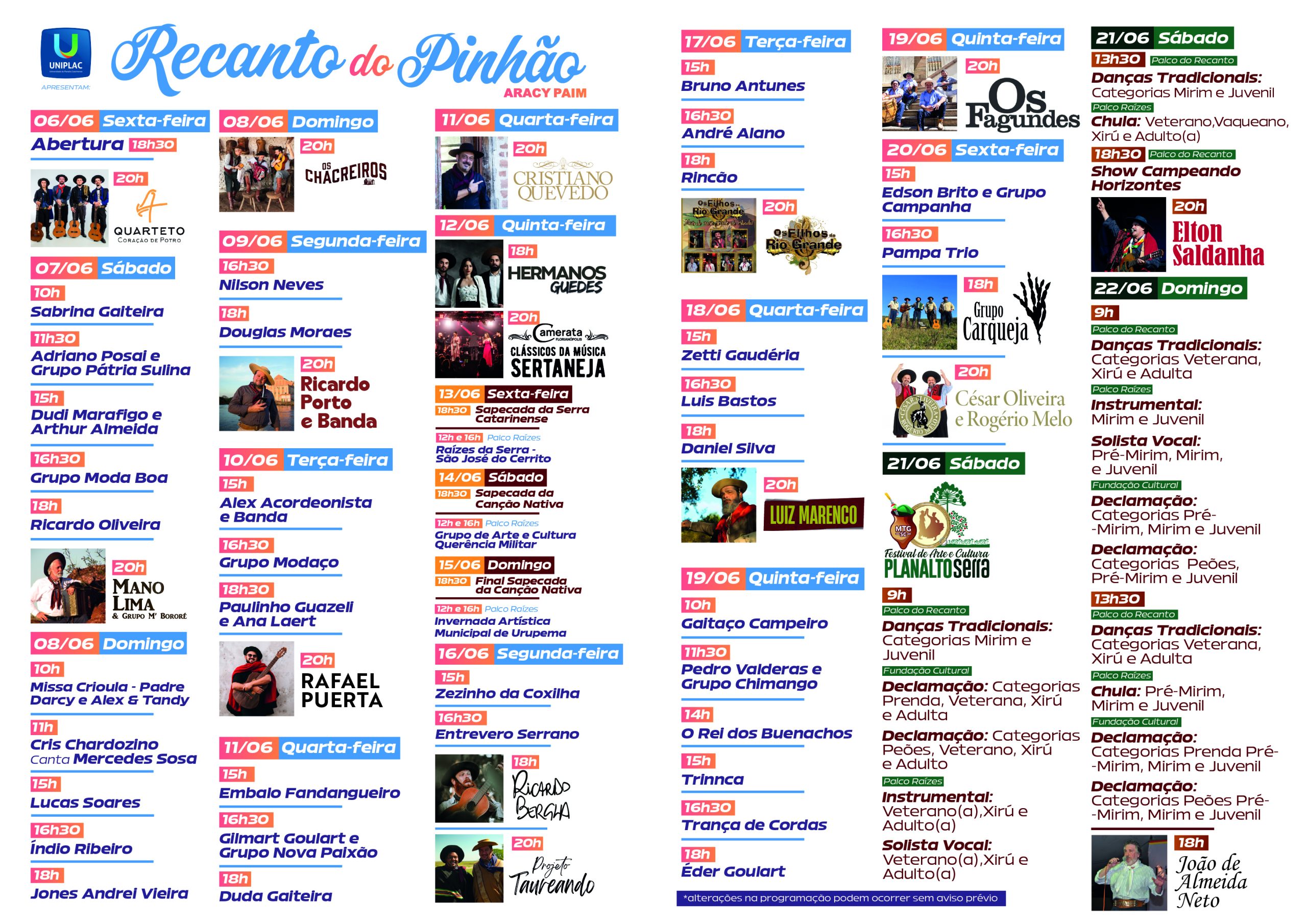 O Recanto do Pinhão Aracy Paim abre espaço para artistas tradicionalistas locais, da Serra Catarinense e do Rio Grande do Sul. Serão mais de cem atrações na totalidade. A solenidade de abertura será no dia 6 de junho, às 18h30min, com a presença de autoridades, lideranças empresariais, agentes culturais, o público lageano, turistas e visitantes de municípios vizinhos.