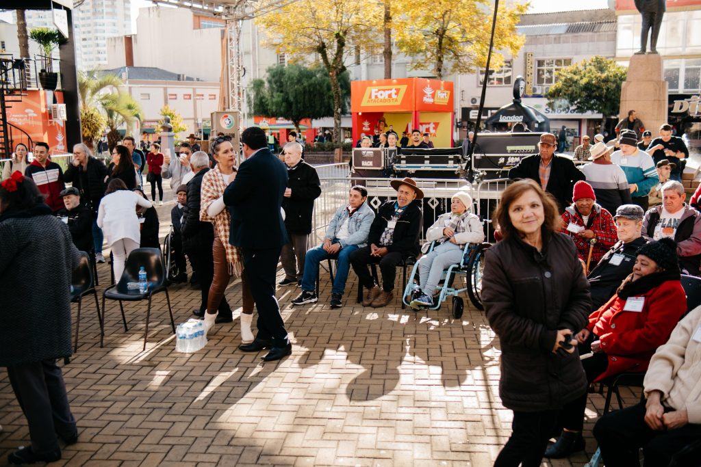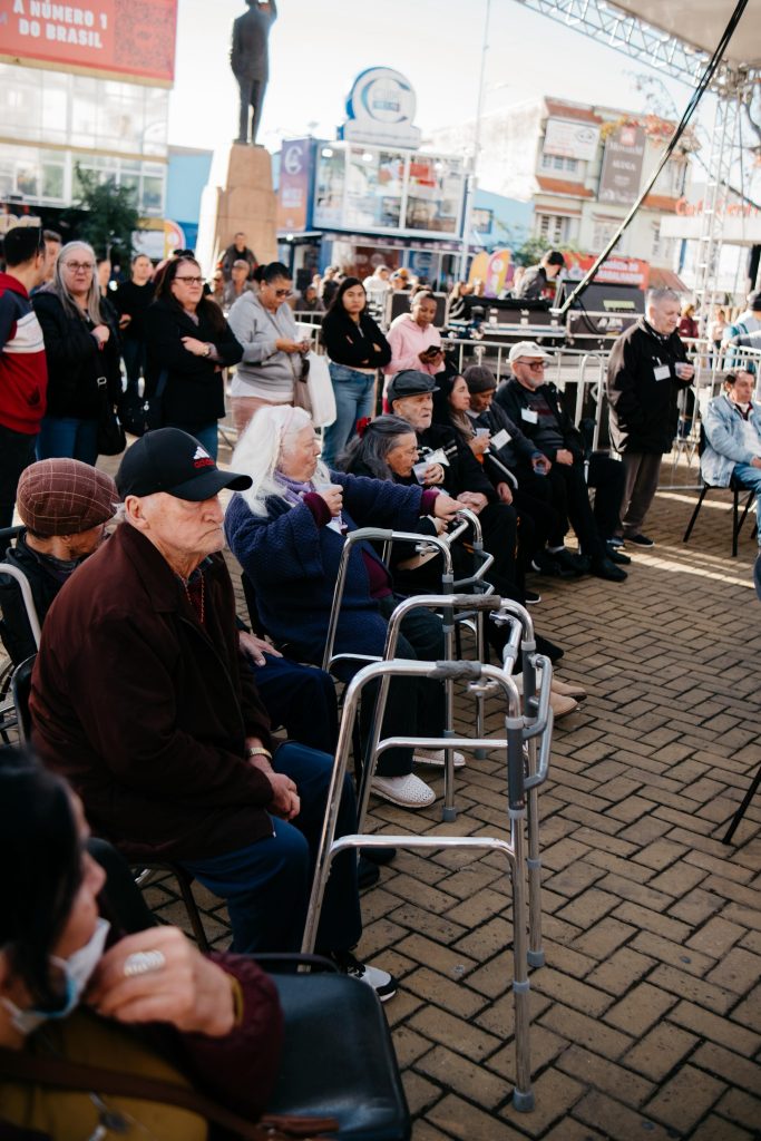 Ao mesmo tempo, a Festa do Pinhão também chegou mais perto dos senhores e senhoras acolhidos pelo Lar Menino Deus, no bairro Petrópolis. Como parte das atividades externas mensais promovidas para os idosos, o mês de junho tem a festividade como tema central. O grupo aproveitou o dia ensolarado para visitar a Praça João Costa, no centro de Lages, onde a Festa ocorre, e se misturar às manifestações culturais.