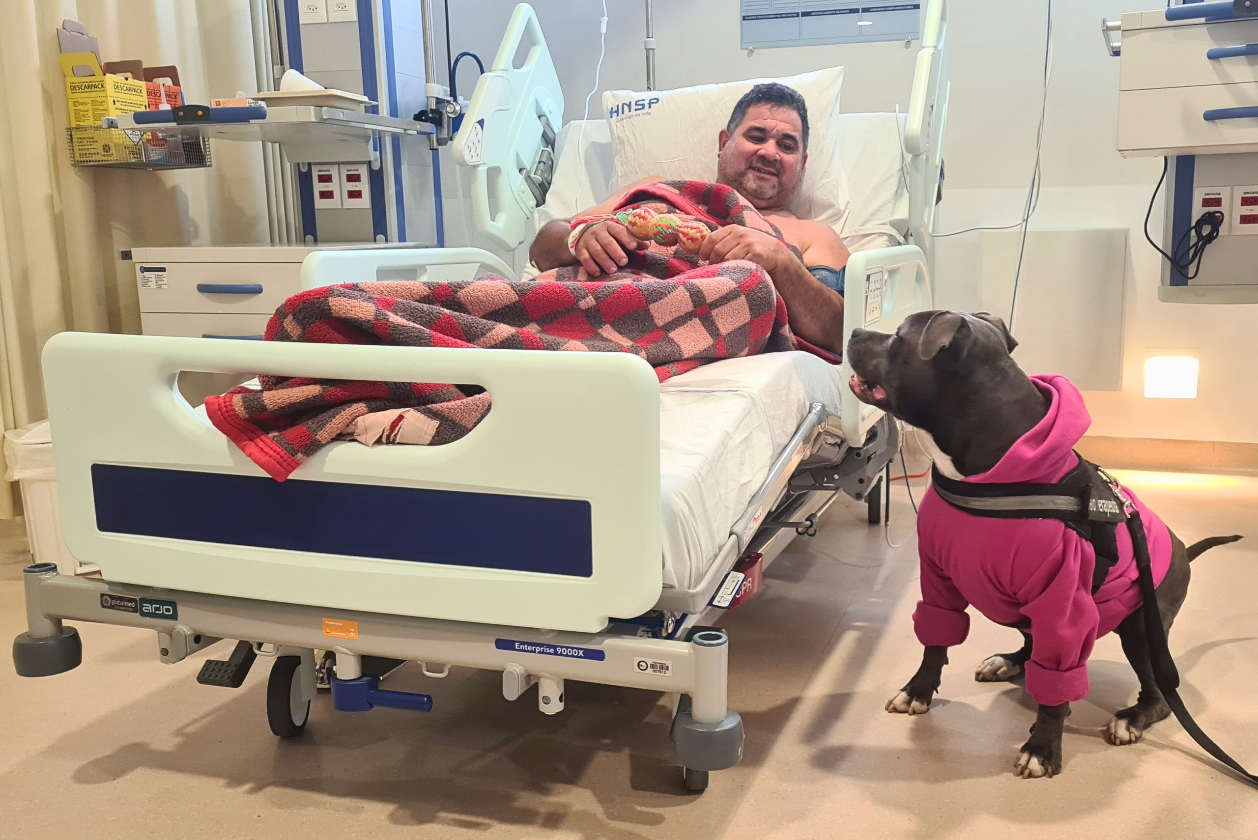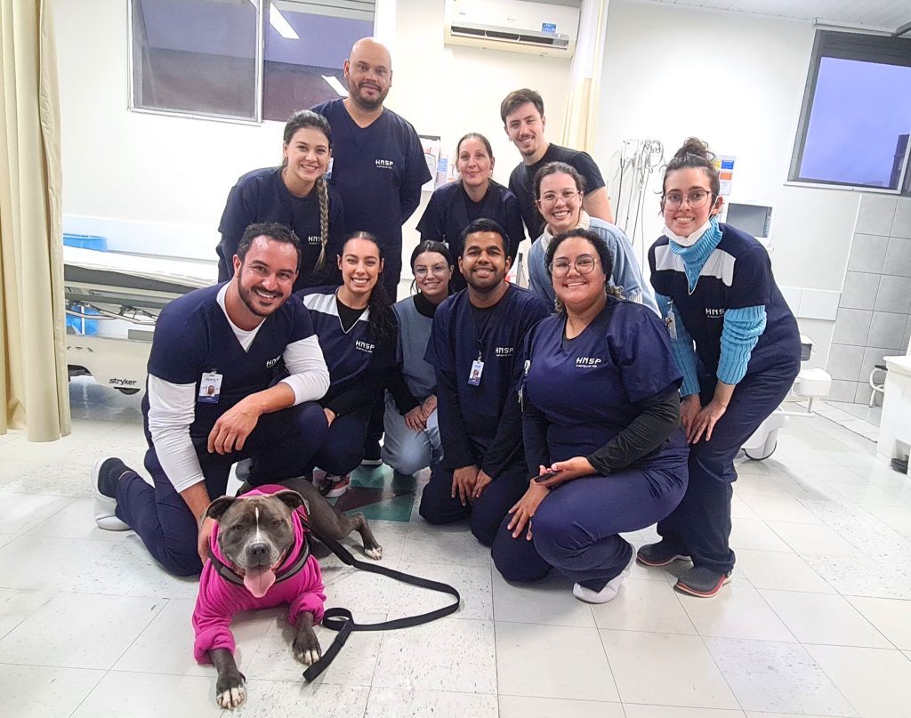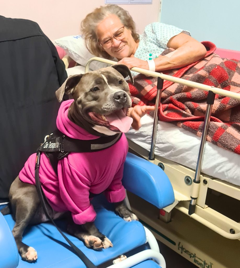 Na porta do quarto, o som das patinhas ecoa leve, mas é capaz de preencher o ambiente com algo que medicamento nenhum entrega: conforto, afeto e esperança. Ao cruzar os corredores da UTI ou das enfermarias, a chegada de Moana — um cão da raça American Staffordshire Terrier, carinhosamente chamada de “Momo” — transforma o hospital em um espaço mais humano, acolhedor e cheio de sorrisos.