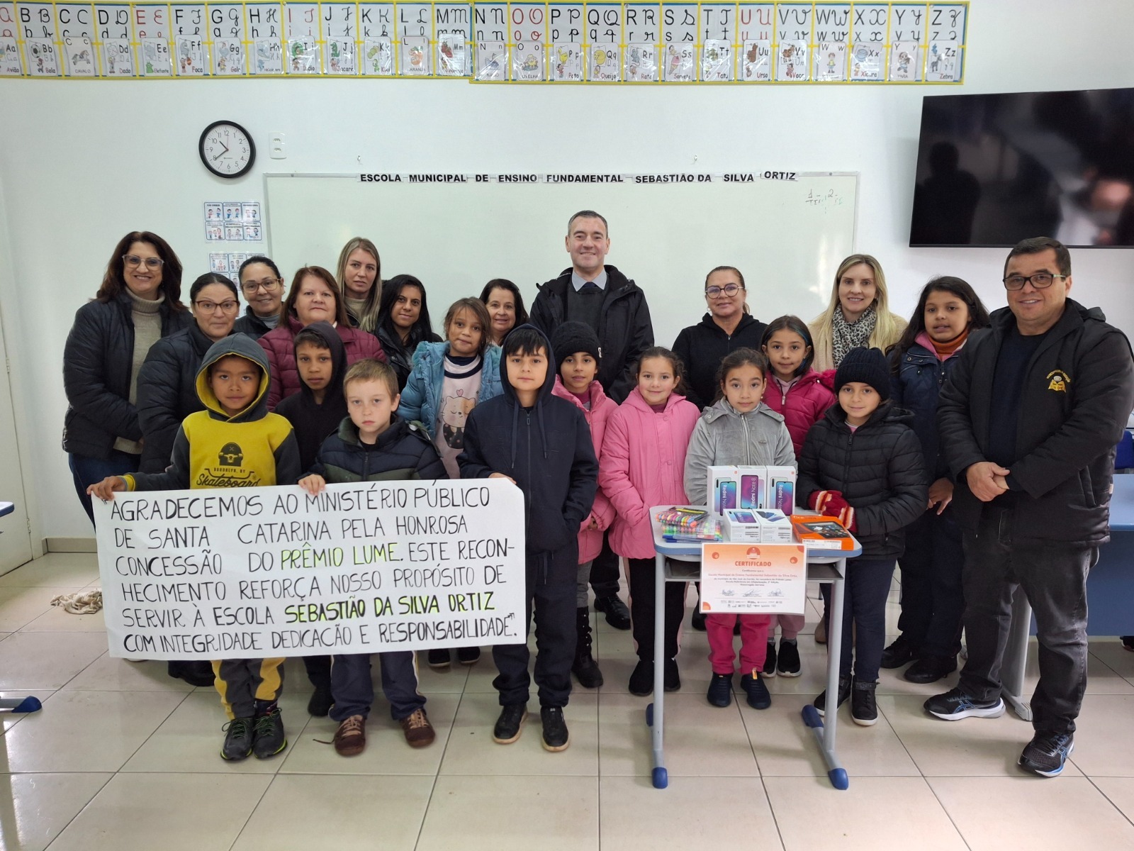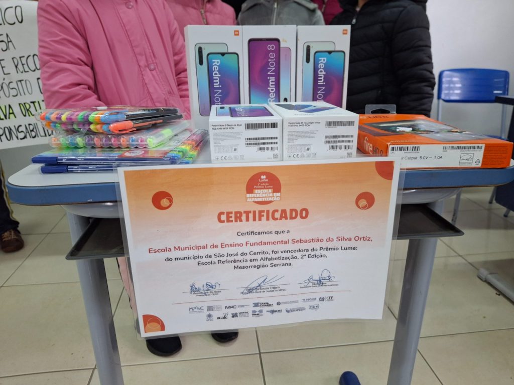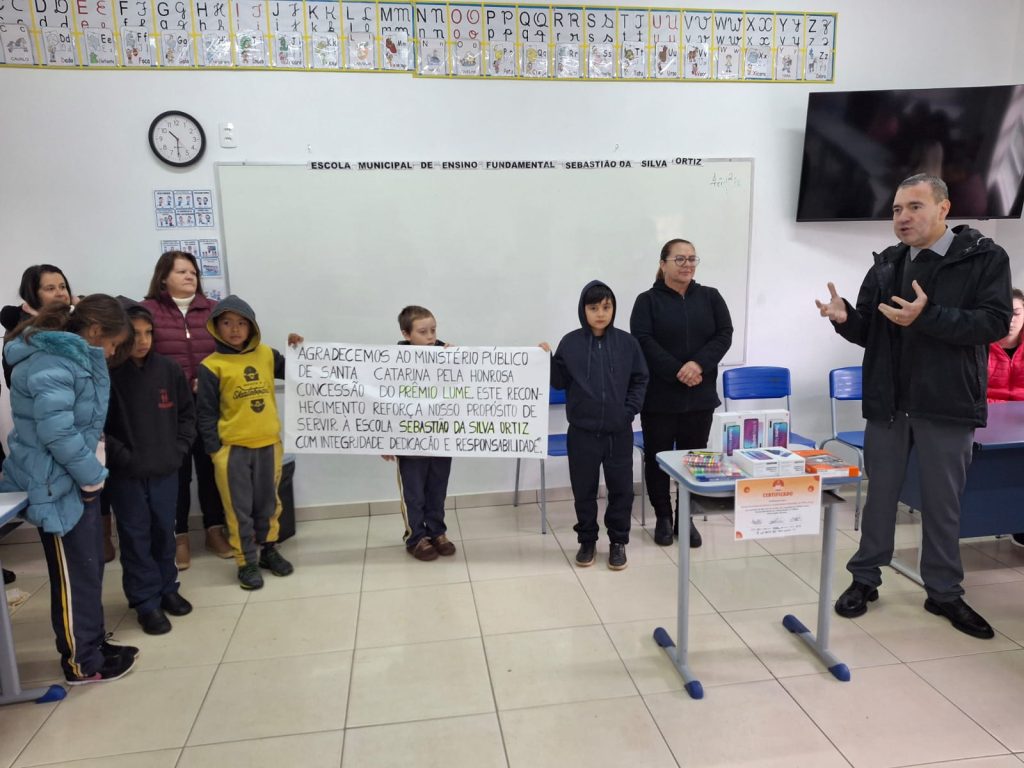 O Promotor de Justiça Giancarlo Rosa Oliveira foi até a instituição de ensino entregar um kit com um tablet, cinco smartphones e estojos de canetas coloridas como premiação, pois o Prêmio Lume é coordenado pelo Ministério Público de Santa Catarina (MPSC). Ele atua na área da infância e juventude e destacou o compromisso da escola com um aprendizado eficiente. “A educação é a base de tudo, e esse resultado foi obtido graças à união de esforços entre os professores e gestores, fazendo com que as crianças estejam motivadas para aprender. Sinto uma enorme felicidade por ter uma escola da minha comarca recebendo esse prêmio, que recompensa todo o trabalho realizado no dia a dia”, disse.