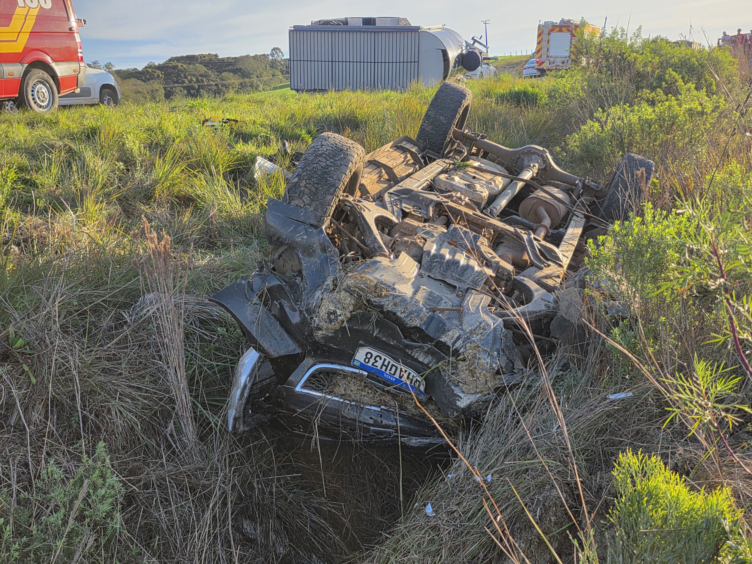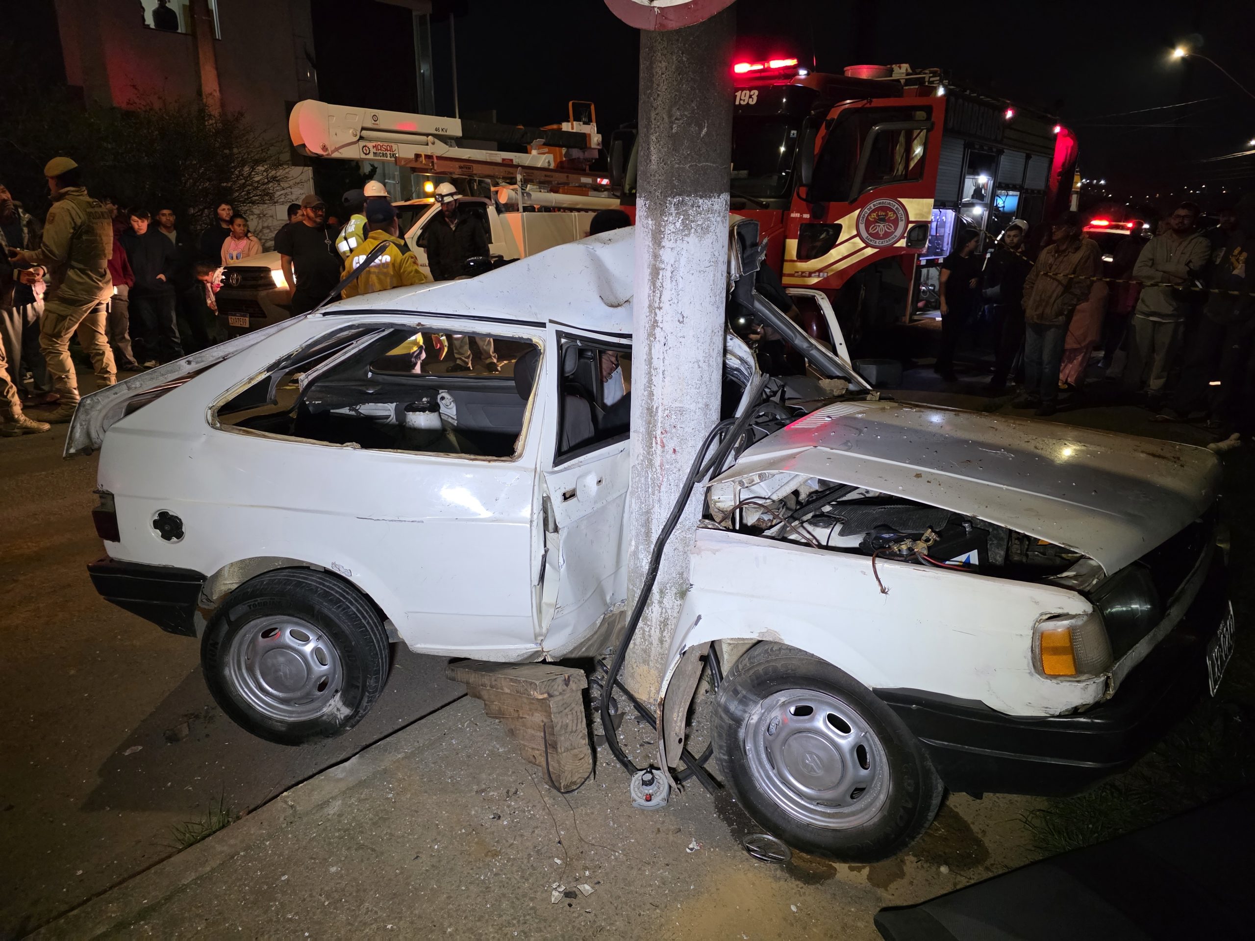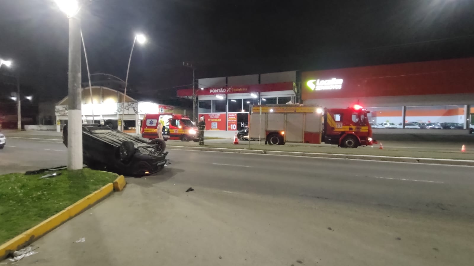 Carro capota após bater em poste na Avenida Duque de Caxias, em Lages