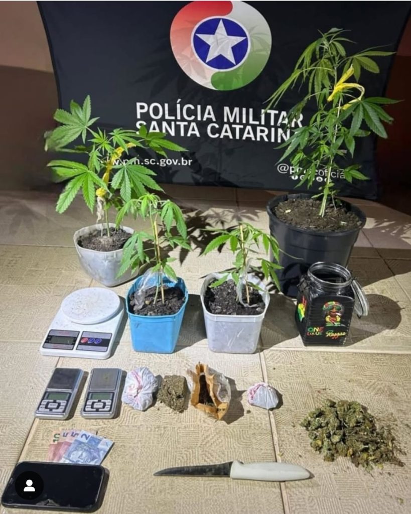 Durante as buscas no quarto do adolescente de 17 anos, foram encontrados 110 gramas de maconha fracionada em porções, 2 gramas de haxixe, três balanças de precisão digitais, uma faca com resquícios de droga na lâmina, R$ 22,00 em dinheiro e um celular modelo iPhone 11. Todos os itens estavam armazenados dentro da gaveta de uma escrivaninha, Além disso, na varanda do