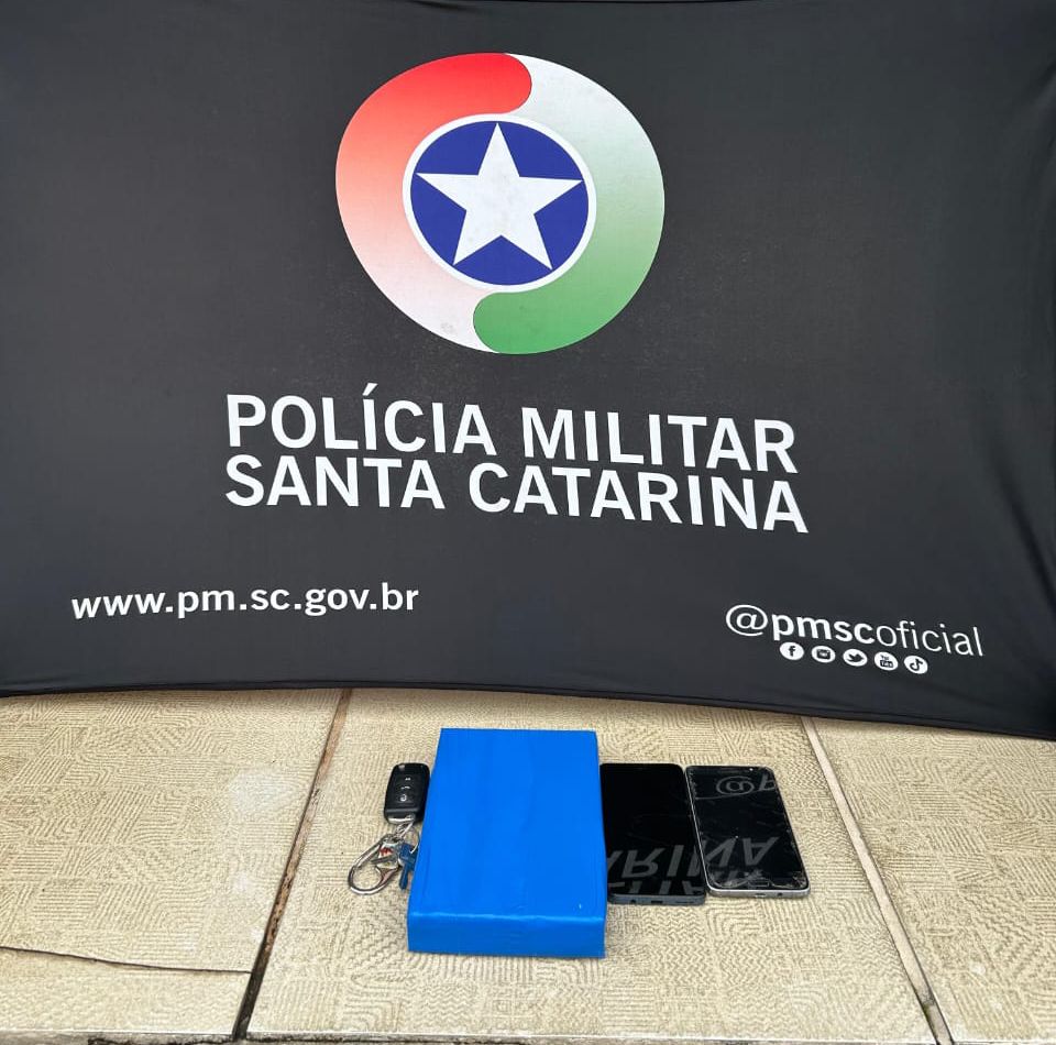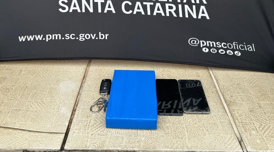 Em ato contínuo, o veículo foi abordado. No interior, encontravam-se o motorista e o passageiro. Foi realizada a busca pessoal, não sendo encontrado nenhum item ilícito com os suspeitos. Contudo, na busca veicular, foram localizados dois aparelhos celulares.
