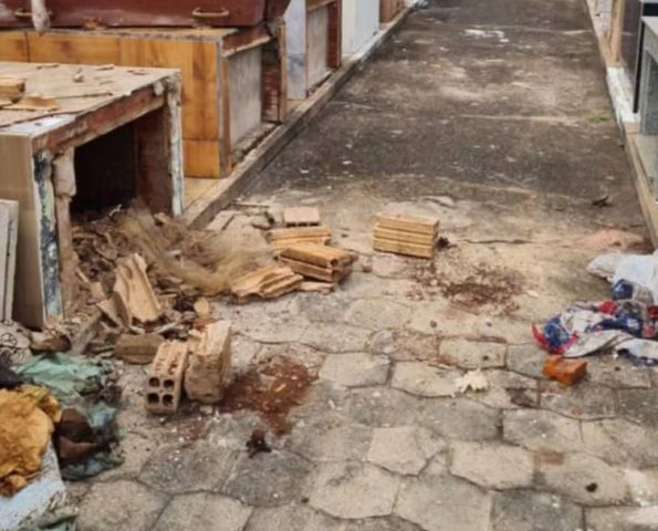 A polícia confirmou a violação de um túmulo no cemitério e recolheu os restos mortais que estavam espalhados pela rua.