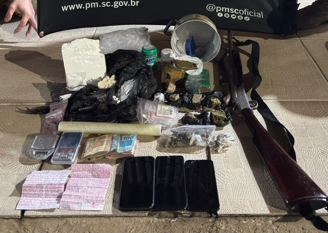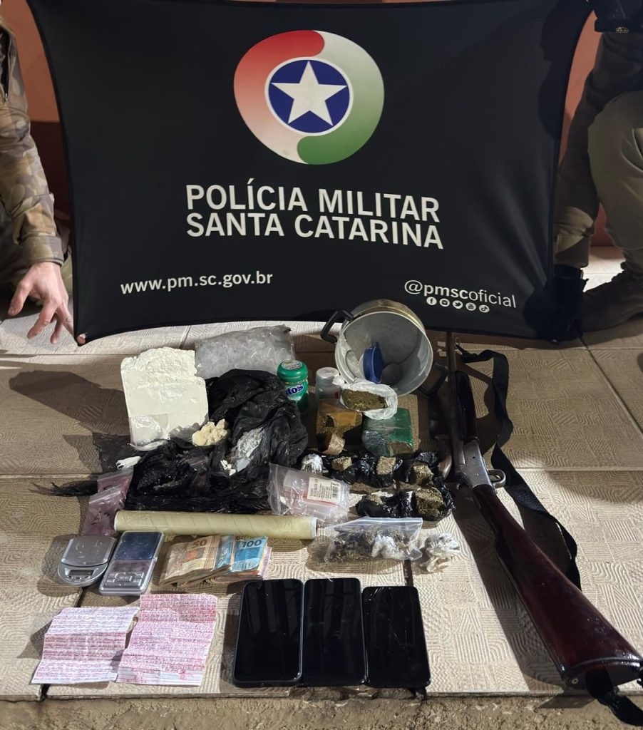 Uma operação conjunta das guarnições do Tático, Rocam e Agência de Inteligência da Polícia Militar resultaram na apreensão de uma significativa quantidade de entorpecentes, uma arma de fogo, balanças de precisão e dinheiro em espécie, na tarde desta segunda-feira(21), no bairro Santo Helena, em Lages.