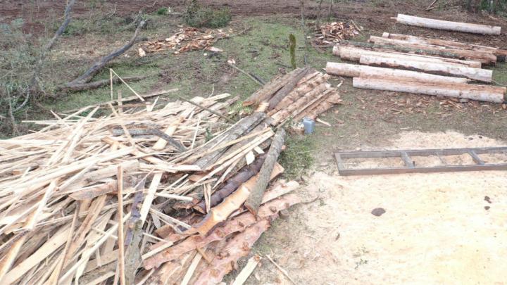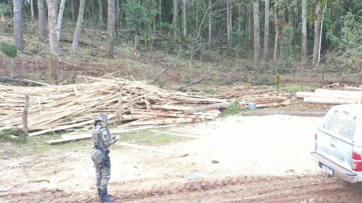 Durante patrulhamento, a guarnição foi informada sobre o corte ilegal de árvores nativas na região. No local, os policiais constataram a supressão de vegetação nativa e o processamento clandestino de madeira. Foram apreendidas 50 toras de pinheiro-brasileiro, totalizando 18,48 metros cúbicos de madeira, além de 15 tábuas (0,19 m³) e cerca de 73,92 estéreos de resíduos do beneficiamento, como costaneiras e aparas.