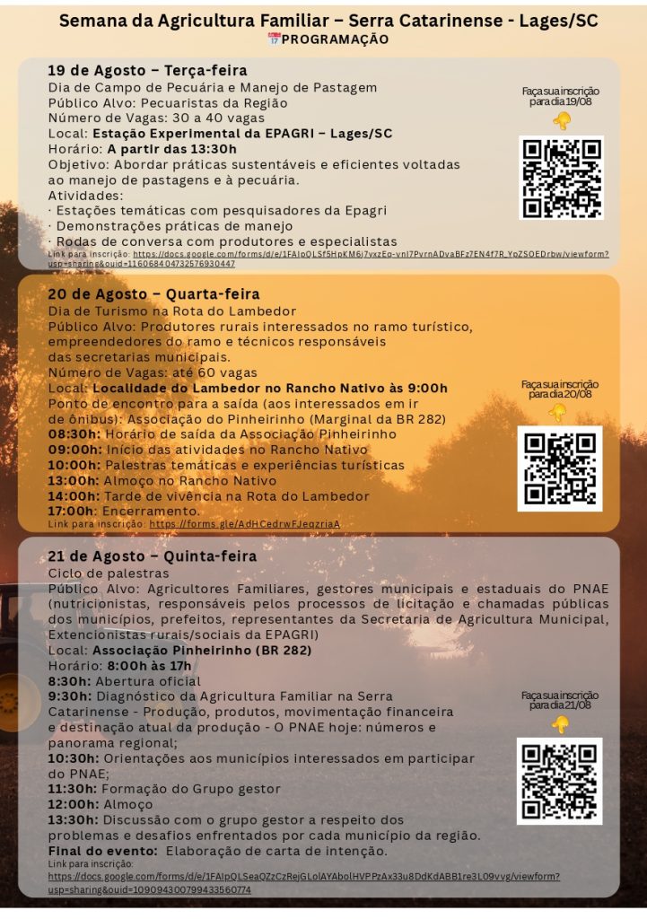 Esta primeira atividade, no dia 19 de agosto, será na Estação Experimental da Epagri, no bairro Morro do Posto, em Lages. Serão desenvolvidas práticas sustentáveis e eficientes voltadas ao manejo de pastagens e à pecuária, com participação de pesquisadores da Epagri (rodas de conversa com produtores e especialistas).