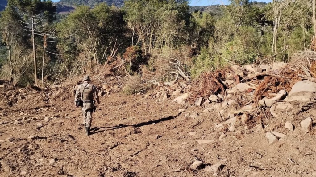 A Polícia Militar Ambiental registrou neste sábado (30) um caso de degradação ambiental na localidade de Morro Grande, em São Joaquim. No local, foram encontradas áreas de preservação permanente devastadas e espécies nativas da Floresta Ombrófila Mista suprimidas, incluindo 114 árvores de Araucária, espécie ameaçada de extinção.